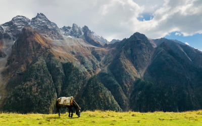 Explore the beautiful Dayara Meadows, a scenic stretch with grazing horses and a backdrop of snow-covered mountains.